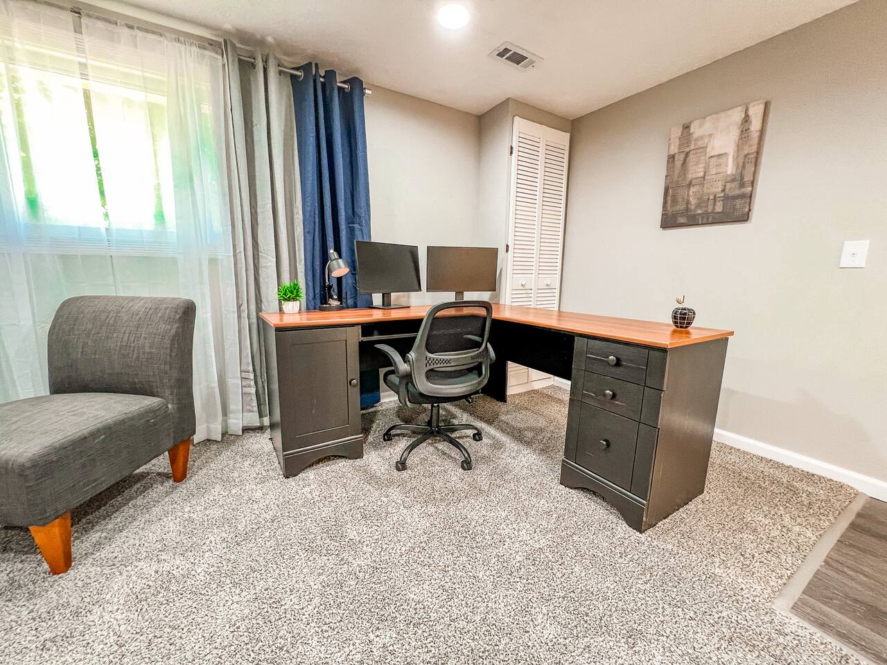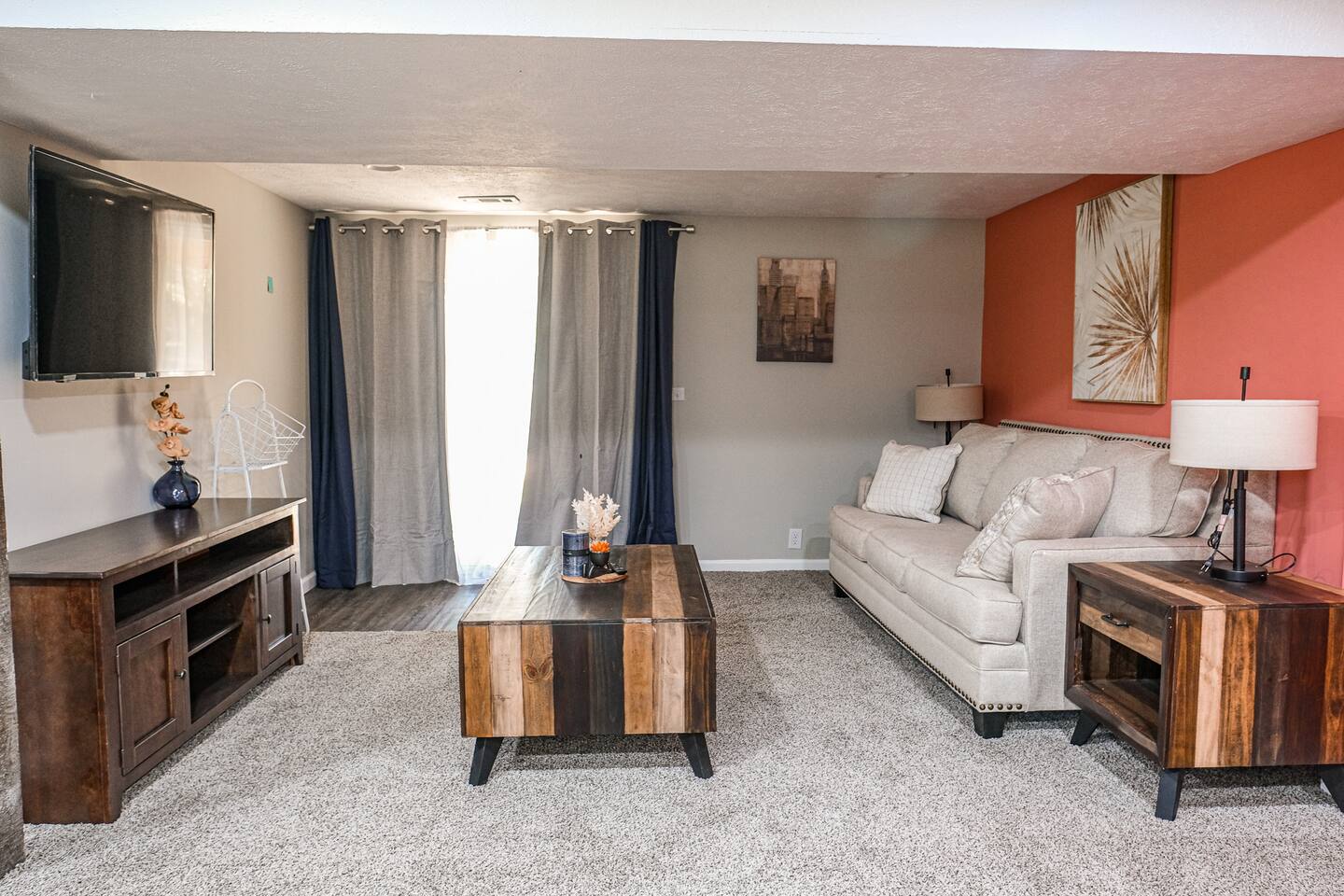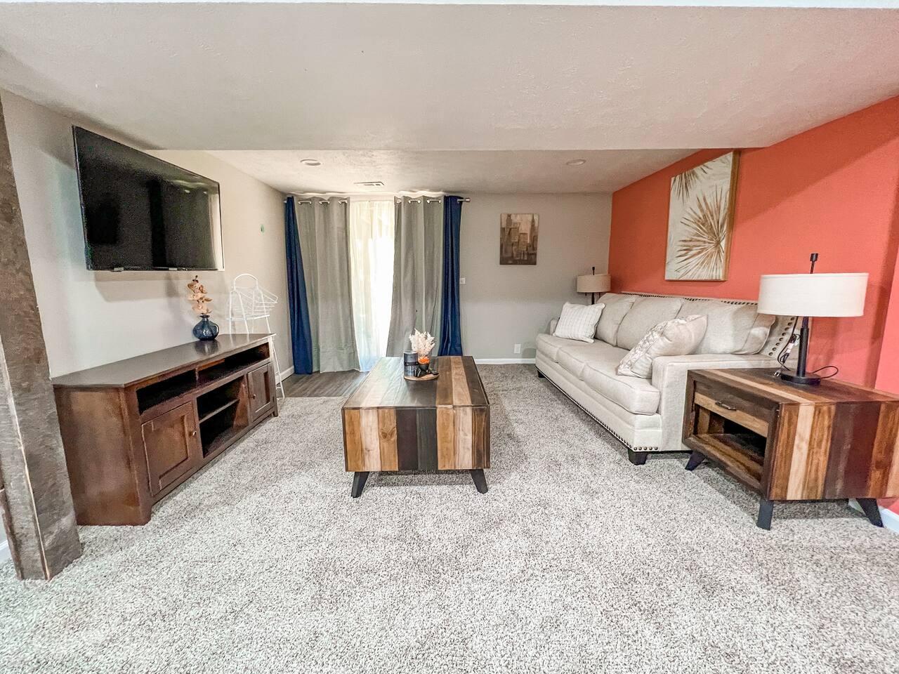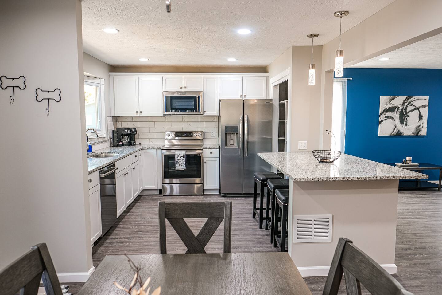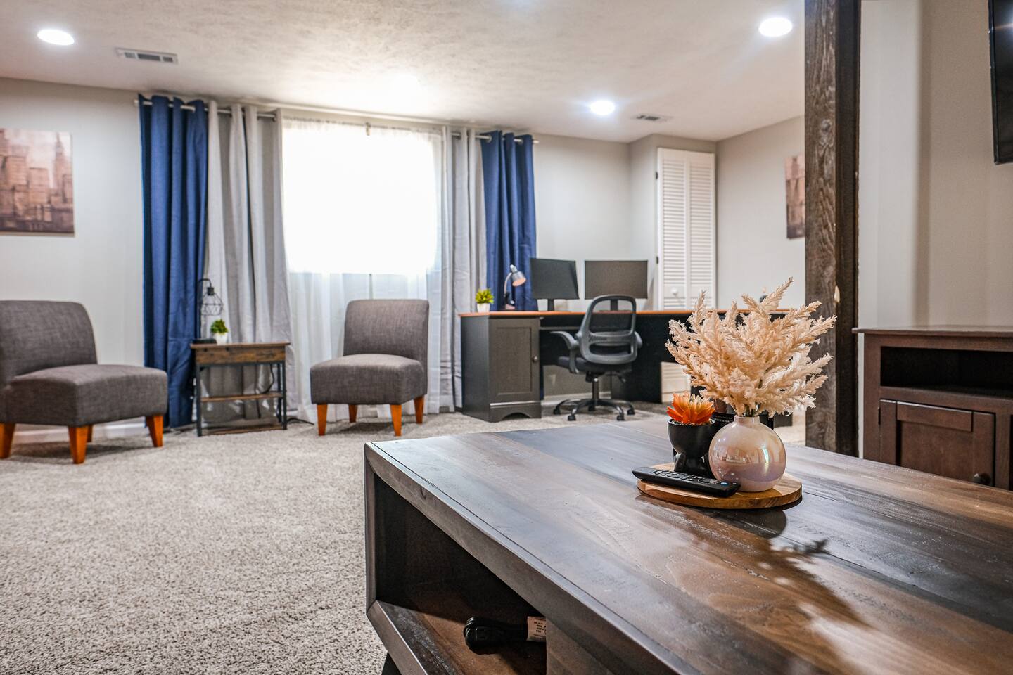 From an insulated private puppy shed to an in-home washer and dryer, this home provides you with extensive amenities so the entire family can feel right at home. Comfortably sleeping 8** guests, this home has a fully-stocked kitchen, 3 bedrooms, 2 bathrooms, a convertible bedroom basement, a covered deck, and a fully-fenced backyard. ★ LIVING ROOM ★ Experience bright, open-concept living with modern, sophisticated finishes. With a comfortable sofa and an HDTV, you will be able to easily unwind, kick back, and relax after a full day of travel. Comfortable Couch Smart HDTV Carefully selected, modern furniture to ensure a beautiful stay ★ KITCHEN ★ Our kitchen is fully equipped with all the cookware, silverware, and appliances you may need to enjoy a quiet breakfast meal or prepare a gourmet dinner at home. Coffee Pot and Coffee Pots & Pans Basic Seasonings Plates, Glassware, & Silverware Children’s Dinnerware Microwave Oven, Refrigerator, and Dishwasher Dining Table and 6 Dining Chairs Pet Water & Food Bowl ★ BEDROOM 1★ The bedrooms are carefully designed to provide you with a cozy, restful experience. Comfortable King Bed Dedicated Workspace Desk with High-Speed WIFI Large HDTV ★ BEDROOM 2★ Comfortable Queen Bed Large HDTV ★ BEDROOM 3★ Comfortable Full Bed ★ BASEMENT ★ Roll-away Full Size Bed Living Space with Couch and HDTV Cozy Stone Fireplace Dedicated Workspace Desk with Dual Monitors In-home washer and dryer machines are located in the basement for use during your stay. Detergent is included for your convenience. ★ BATHROOMS ★ Fully remodeled, these modern bathrooms feature everything you need to freshen up each day. Hotel Quality Towels & Linens Shower Soaking Bathtub ★ OUTDOOR DECK & MODERN PUPPY SHED ★ Begin your day with morning coffee enjoyed on the sunlit deck! With outdoor lounging furniture and a private luxurious shed for your pup, this home is sure to help the entire family enjoy the crisp Nebraska air with comfort and ease! Oversized Outdoor Deck Comfortable Outdoor Couches & Chairs Propane Grill Insulated Puppy Shed Elevated Dog Cot Fully Fenced Backyard .