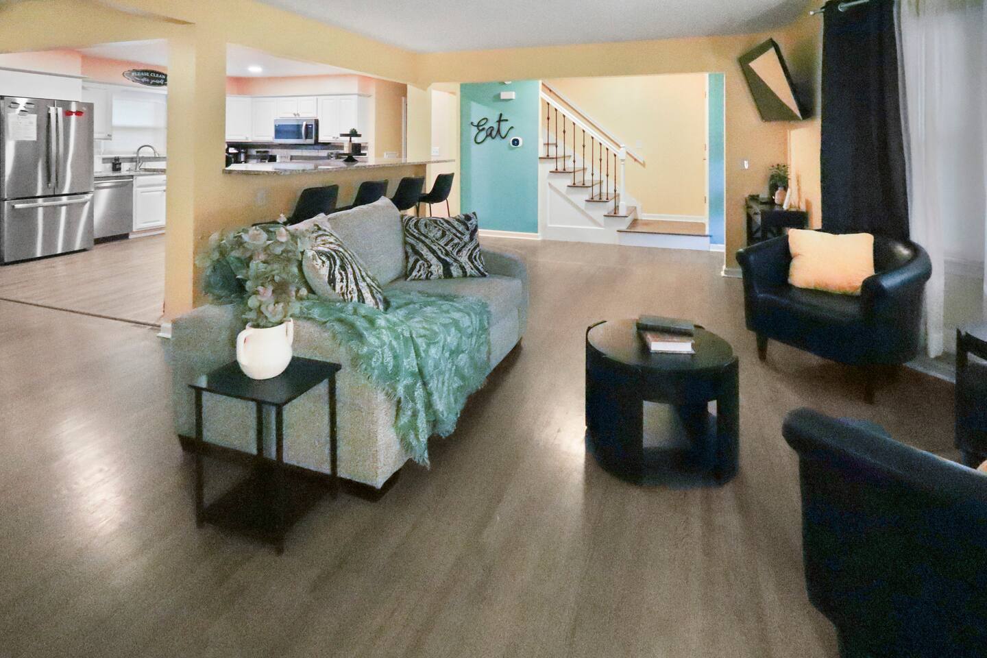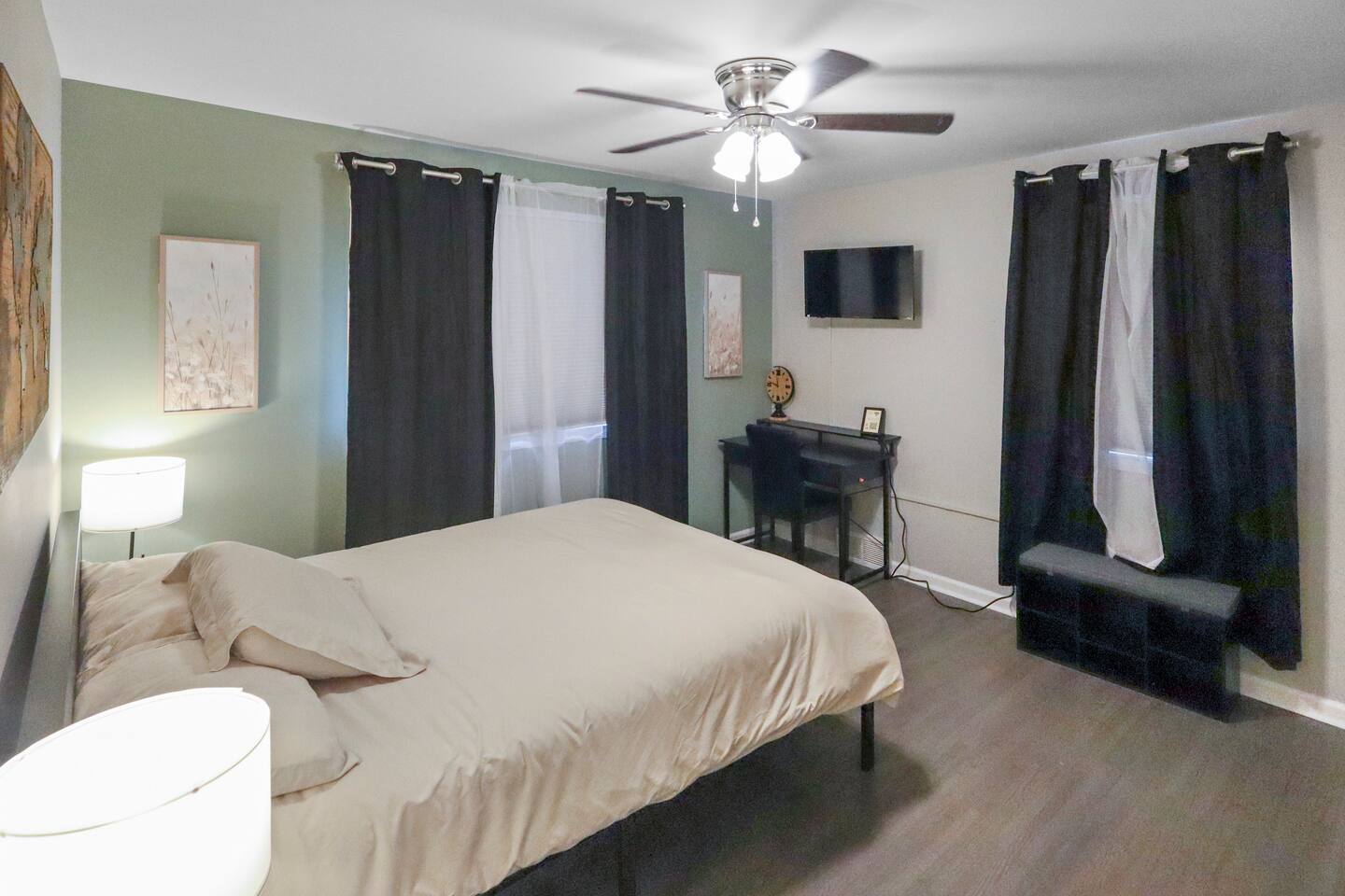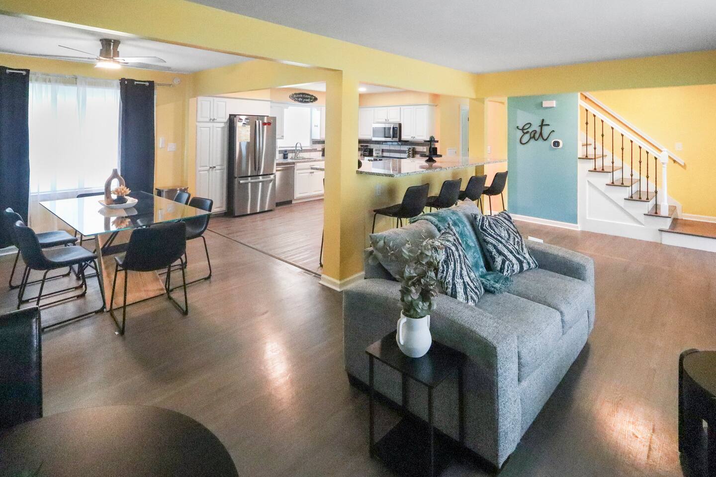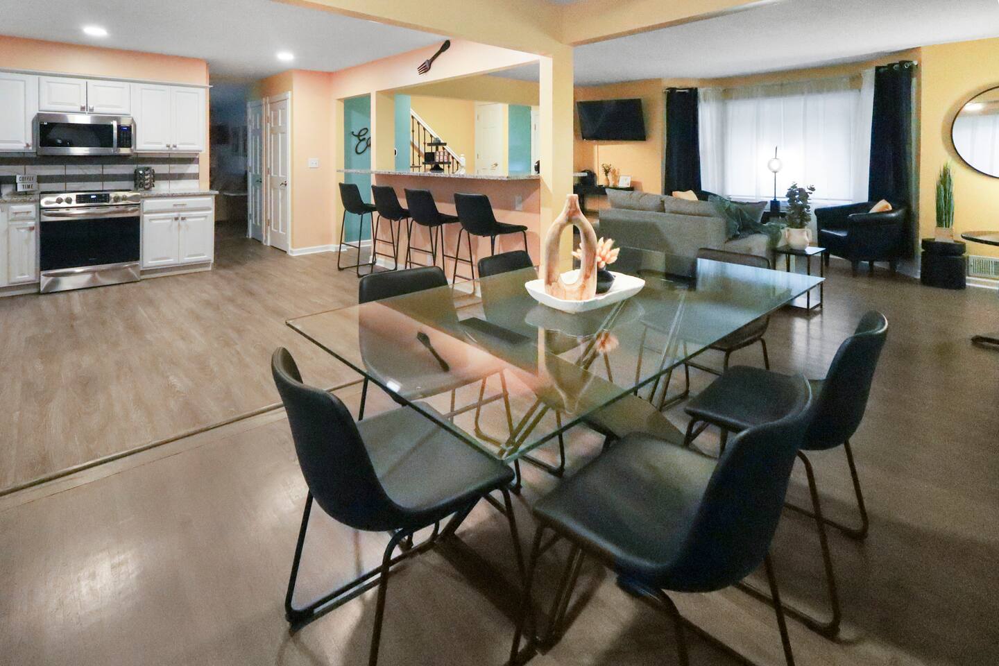 Stunning 6-bedroom, 3.5-bathroom home in the heart of Omaha, designed for large groups and families seeking comfort and convenience. With ample space and modern amenities, this pet-friendly haven is your ideal home away from home! This six-bedroom home features a dedicated workspace in every bedroom. ★ LIVING ROOM ★ Experience bright, open-concept living with modern, sophisticated finishes. With a comfortable sofa, cozy fireplace, and an HDTV, you can easily unwind, kick back, and relax each day. Comfy, stylish sofa – perfect for relaxing Smart HDTV with your favorite streaming apps Thoughtfully curated modern furniture for a beautiful, comfortable stay Open to kitchen ★ KITCHEN ★ Our kitchen is fully equipped with all the cookware, silverware, and appliances you may need to enjoy a quick bite for breakfast or a gourmet meal for dinner. Coffee pot & complimentary coffee Pots, pans, utensils, and basic seasonings Plates, glassware, and silverware for your entire group Modern appliances: oven, microwave, refrigerator, and dishwasher Dining Table and 12 Dining Chairs ★ Primary bedroom ★ The bedroom suites are carefully designed to provide you with a cozy, restful experience. -Comfortable Room with King Bed -Dedicated Workspace Desk with High-Speed WIFI -Large HDTV with Amazon Prime -Blackout Blinds -Pack N’ Play Private ensuite bathroom with double sink and shower ★ Bedroom 2★ -Comfortable Room with King Bed -Dedicated Workspace Desk with High-Speed WIFI -Large HDTV with Amazon Prime -Blackout Blinds -Large Closet ★ Bedroom 3★ -Comfortable Room with Queen Bed -Dedicated Workspace Desk with High-Speed WIFI -Large HDTV with Amazon Prime -Blackout Blinds ★ Bedroom 4★ -Comfortable Room with Queen Bed -Dedicated Workspace Desk with High-Speed WIFI -Large HDTV with Amazon Prime -Blackout Blinds ★ Bedroom 5★ -Comfortable Room with King Bed -Dedicated Workspace Desk with High-Speed WIFI -Large HDTV with Amazon Prime -Blackout Blinds ★ Bedroom 6★ -Comfortable Room with King Bed -Dedicated Workspace Desk with High-Speed WIFI -Large HDTV with Amazon Prime -Blackout Blinds 2 washing machines and 3 dryers are located in the basement for use during your stay. The extra units make large amounts of laundry easy. ★ BATHROOMS ★ Fully remodeled, these modern bathrooms feature everything you need to freshen up each day. Hotel Quality Towels & Linens Basic toiletries Walk-In Shower Soaking Bathtub ★ OUTDOOR DECK & PATIO ★ With a beautiful open backyard and picnic seating for 12 guests, this home ensures a relaxing, peaceful stay. -Oversized Outdoor Patio -2 Large Picnic Tables -Propane Grill