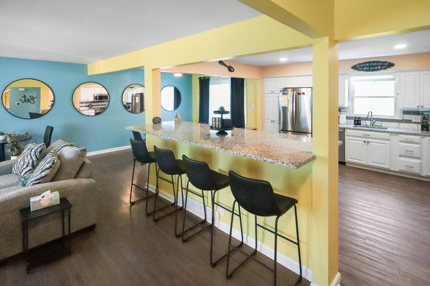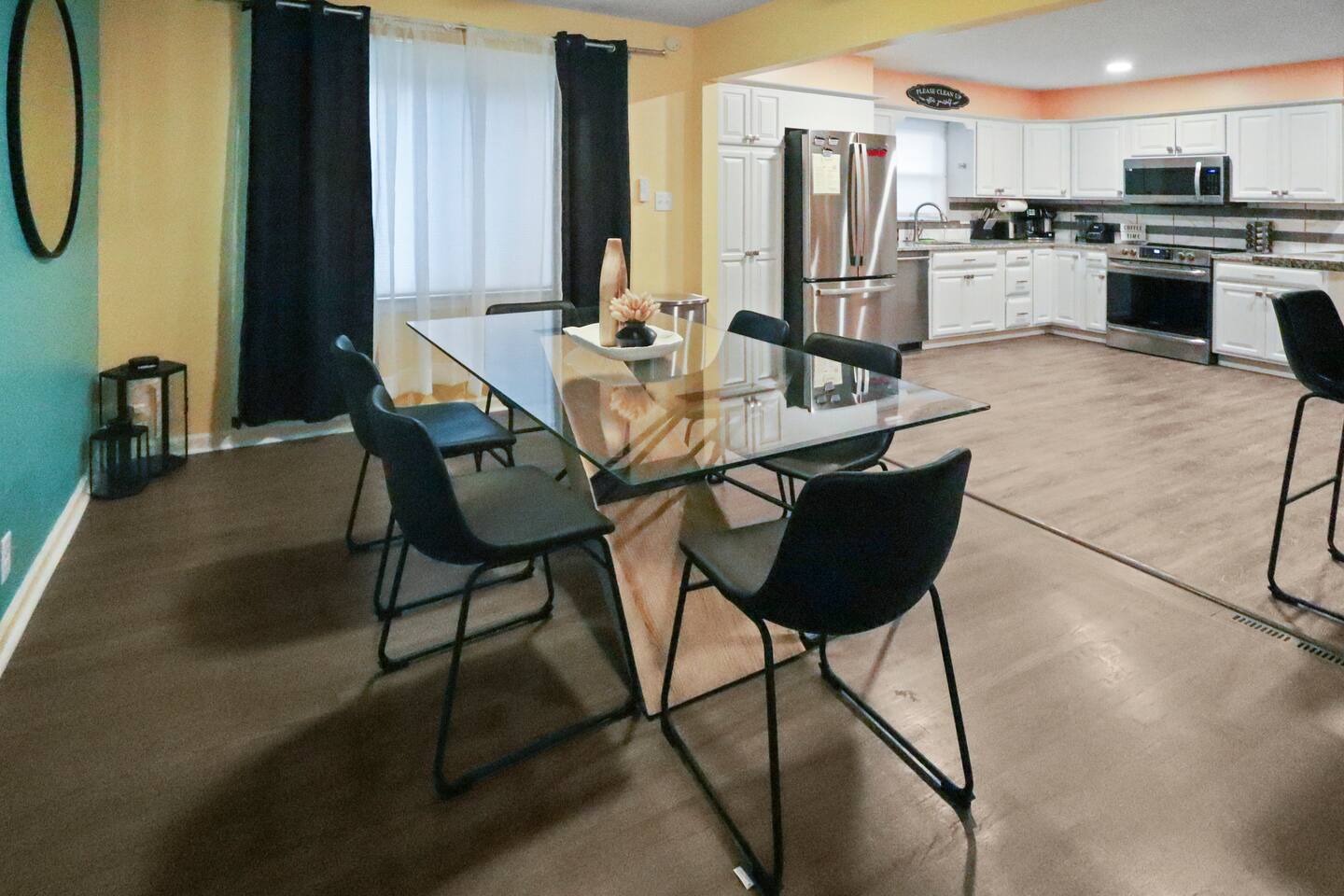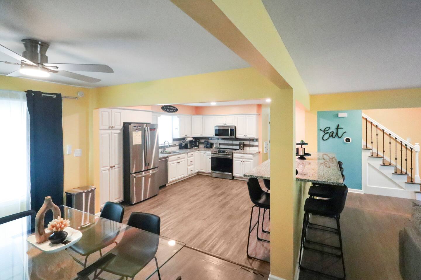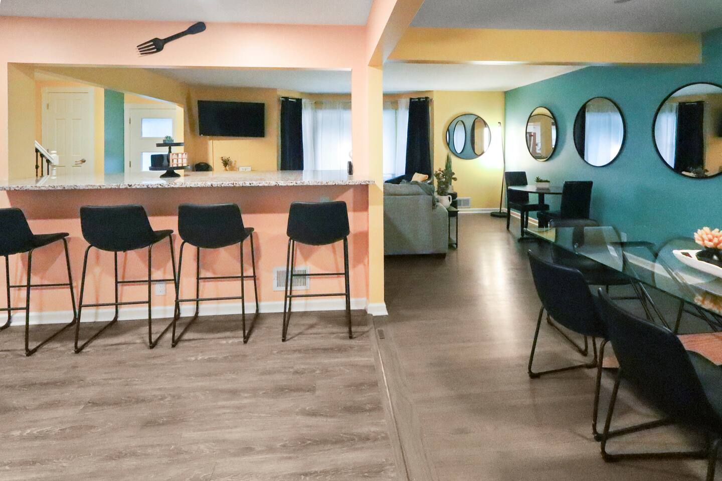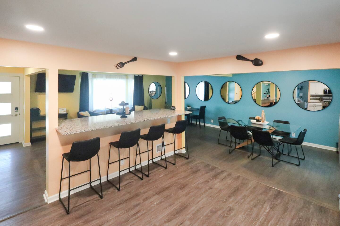 Stunning 6-bedroom, 3.5-bathroom home in the heart of Omaha, designed for large groups and families seeking comfort and convenience. With ample space and modern amenities, this pet-friendly haven is your ideal home away from home! This six-bedroom home features a dedicated workspace in every bedroom. ★ LIVING ROOM ★ Experience bright, open-concept living with modern, sophisticated finishes. With a comfortable sofa, cozy fireplace, and an HDTV, you can easily unwind, kick back, and relax each day. Comfy, stylish sofa – perfect for relaxing Smart HDTV with your favorite streaming apps Thoughtfully curated modern furniture for a beautiful, comfortable stay Open to kitchen ★ KITCHEN ★ Our kitchen is fully equipped with all the cookware, silverware, and appliances you may need to enjoy a quick bite for breakfast or a gourmet meal for dinner. Coffee pot & complimentary coffee Pots, pans, utensils, and basic seasonings Plates, glassware, and silverware for your entire group Modern appliances: oven, microwave, refrigerator, and dishwasher Dining Table and 12 Dining Chairs ★ Primary bedroom ★ The bedroom suites are carefully designed to provide you with a cozy, restful experience. -Comfortable Room with King Bed -Dedicated Workspace Desk with High-Speed WIFI -Large HDTV with Amazon Prime -Blackout Blinds -Pack N’ Play Private ensuite bathroom with double sink and shower ★ Bedroom 2★ -Comfortable Room with King Bed -Dedicated Workspace Desk with High-Speed WIFI -Large HDTV with Amazon Prime -Blackout Blinds -Large Closet ★ Bedroom 3★ -Comfortable Room with Queen Bed -Dedicated Workspace Desk with High-Speed WIFI -Large HDTV with Amazon Prime -Blackout Blinds ★ Bedroom 4★ -Comfortable Room with Queen Bed -Dedicated Workspace Desk with High-Speed WIFI -Large HDTV with Amazon Prime -Blackout Blinds ★ Bedroom 5★ -Comfortable Room with King Bed -Dedicated Workspace Desk with High-Speed WIFI -Large HDTV with Amazon Prime -Blackout Blinds ★ Bedroom 6★ -Comfortable Room with King Bed -Dedicated Workspace Desk with High-Speed WIFI -Large HDTV with Amazon Prime -Blackout Blinds 2 washing machines and 3 dryers are located in the basement for use during your stay. The extra units make large amounts of laundry easy. ★ BATHROOMS ★ Fully remodeled, these modern bathrooms feature everything you need to freshen up each day. Hotel Quality Towels & Linens Basic toiletries Walk-In Shower Soaking Bathtub ★ OUTDOOR DECK & PATIO ★ With a beautiful open backyard and picnic seating for 12 guests, this home ensures a relaxing, peaceful stay. -Oversized Outdoor Patio -2 Large Picnic Tables -Propane Grill