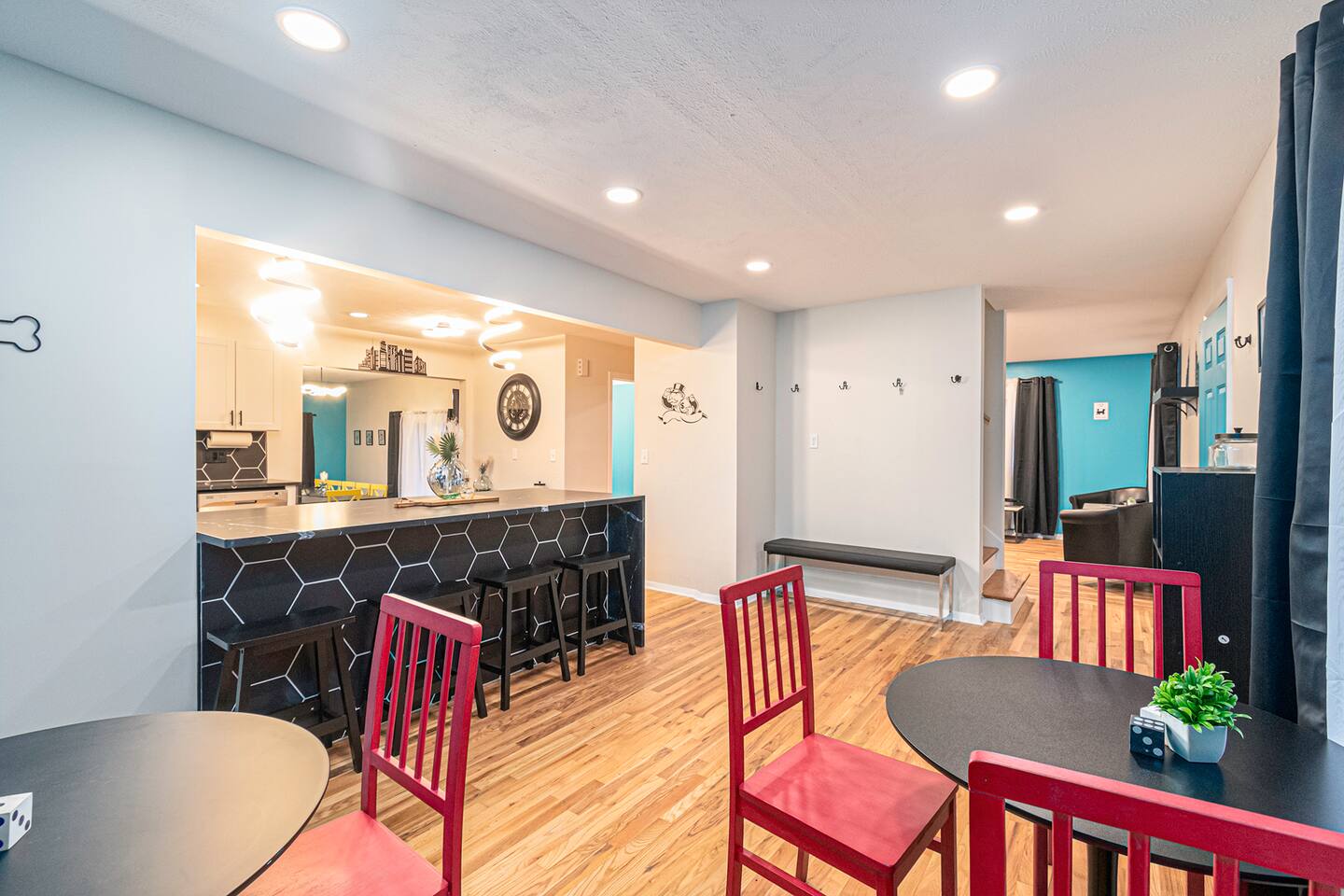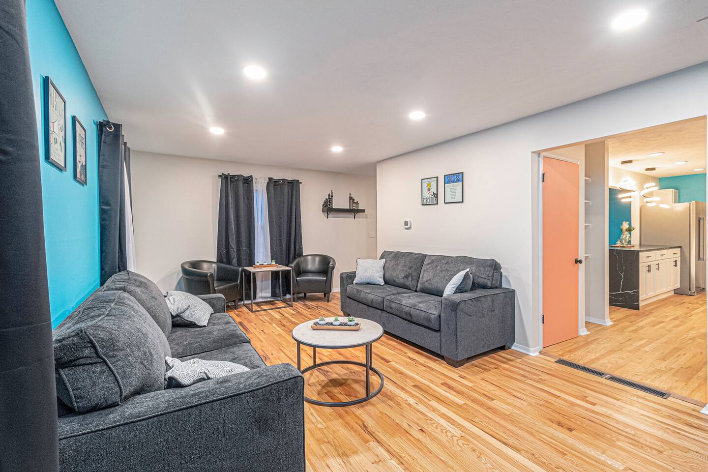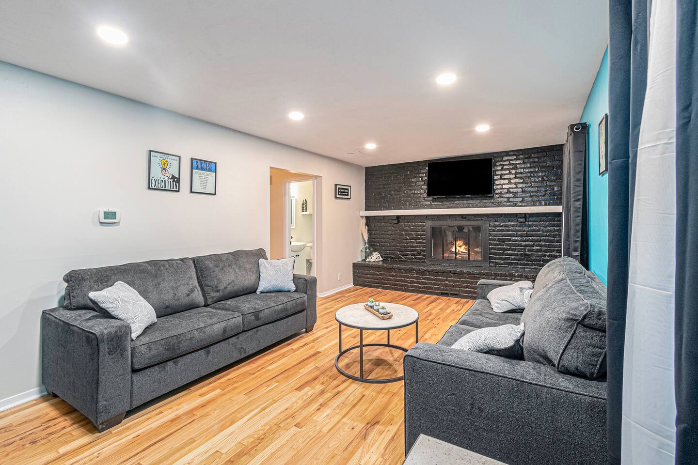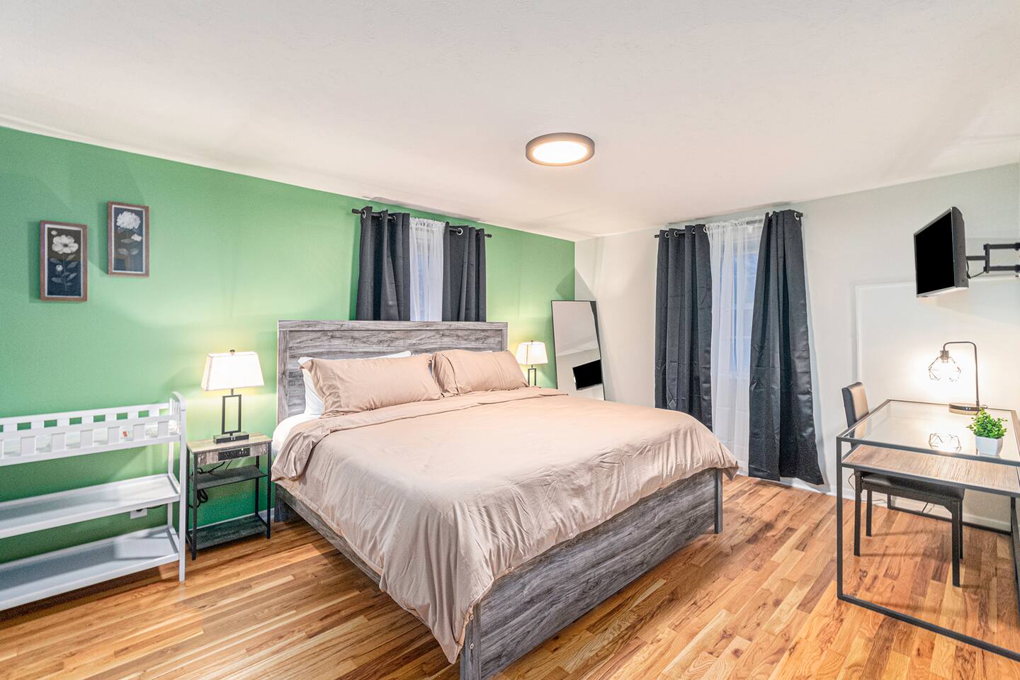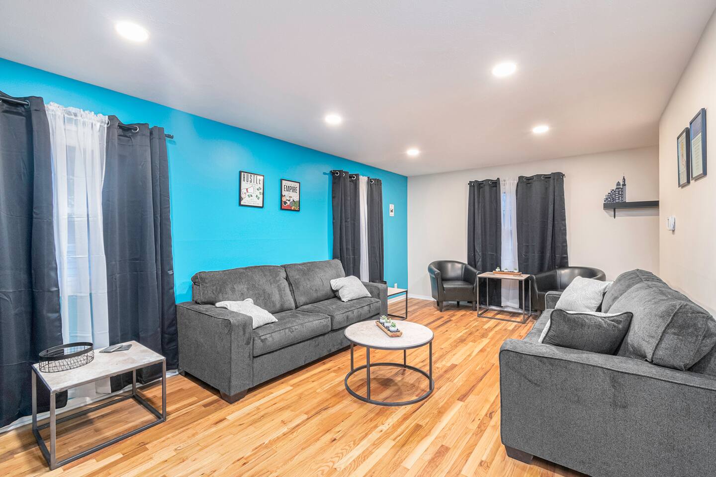 Easily convert this six bedroom home into three separate suites complete with a private bathroom, one king bed, one full bed, and a dedicated work space. With extensive amenities, a fully-stocked kitchen, laundry room, and a fully-fenced outdoor space, this home is perfect for accommodating groups. ★ LIVING ROOM ★ Experience bright, open-concept living with modern, sophisticated finishes. With a comfortable sofa, and an HDTV, you will be able to easily unwind, kick back, and relax each day. Note: The fireplace is decorative and not in use. Comfortable Couch Smart HDTV with Amazon Prime Carefully selected, modern furniture to ensure a beautiful stay ★ KITCHEN ★ Our kitchen is fully equipped with all the cookware, silverware, and appliances you may need to enjoy a quick bite for breakfast or a gourmet meal for dinner. Coffee Pot and Coffee Pots & Pans Basic Seasonings Plates, Glassware, & Silverware Microwave Oven, Refrigerator, and Dishwasher Dining Table and 12 Dining Chairs ★ SUITE 1 ★ The bedroom suites are carefully designed to provide you with a cozy, restful experience. Comfortable Room with King Bed Comfortable Room with Full Bed Dedicated Workspace Desk with High-Speed WIFI Large HDTV with Amazon Prime Private ensuite bathroom ★ SUITE 2★ Comfortable Room with King Bed Comfortable Room with Full Bed Dedicated Workspace Desk with High-Speed WIFI Large HDTV with Amazon Prime Private ensuite bathroom ★ SUITE 3★ Comfortable Room with King Bed Comfortable Room with Full Bed Dedicated Workspace Desk with High-Speed WIFI Large HDTV with Amazon Prime Private ensuite bathroom In-home 2 washer and 3 dryer machines are located in the basement for use during your stay. ★ BATHROOMS ★ Fully remodeled, these modern bathrooms feature everything you need to freshen up each day. Hotel Quality Towels & Linens Walk-In Shower Bathroom 2, has a BathTub. Essential Toiletries ★ OUTDOOR DECK & PATIO ★ Begin your day with morning coffee enjoyed on the open-air patio! With a fully-fenced privacy backyard and picnic seating for 12 guests, this home ensures a relaxing, peaceful stay. Oversized Outdoor Patio Four Large Picnic Tables Propane Grill Decorative String Lighting Fully Fenced Backyard