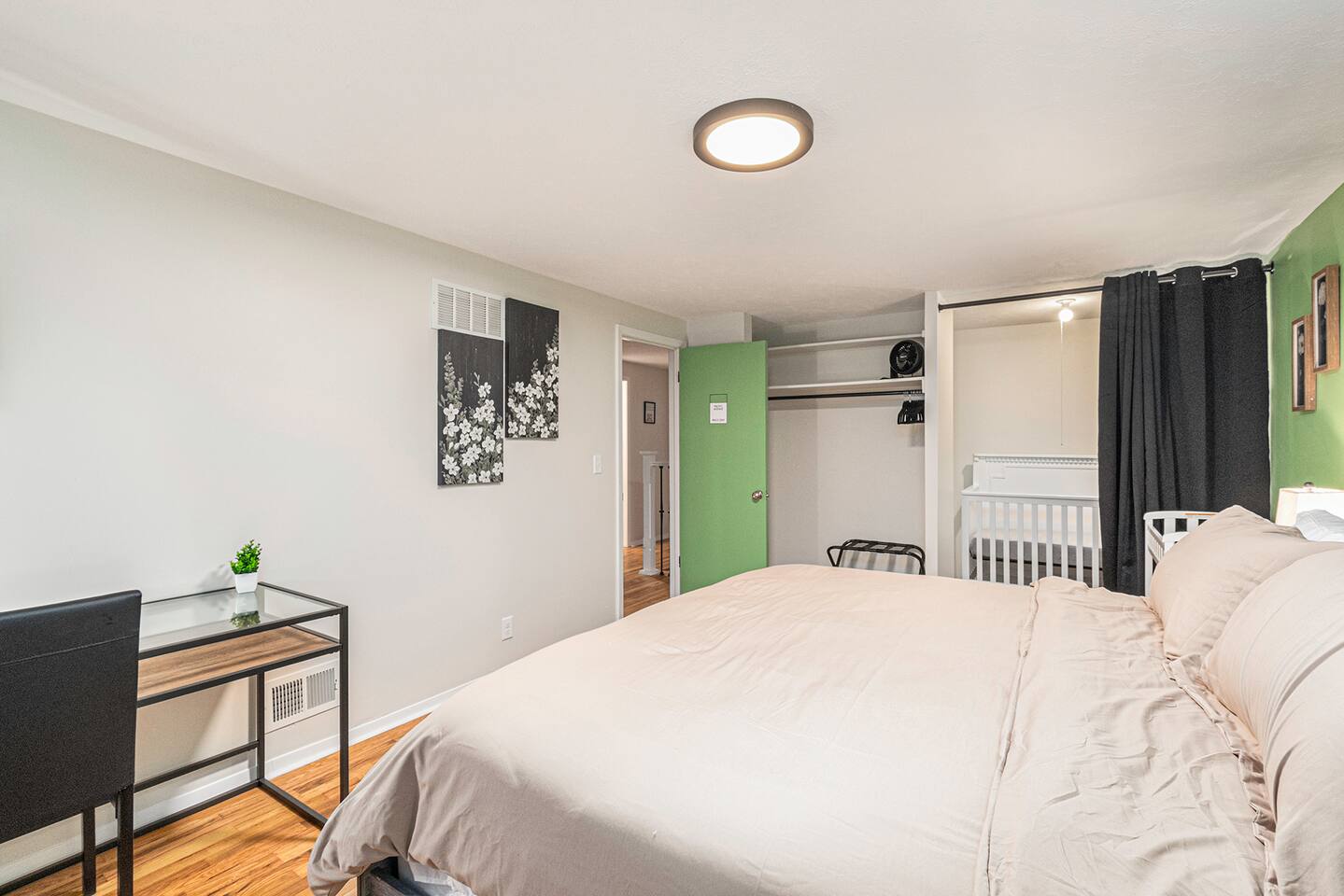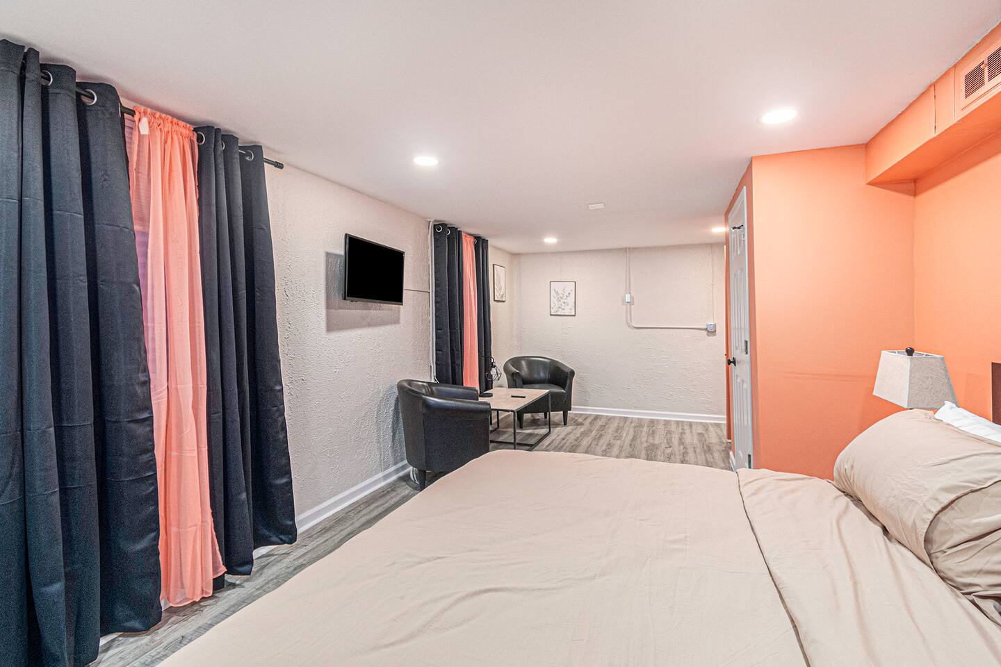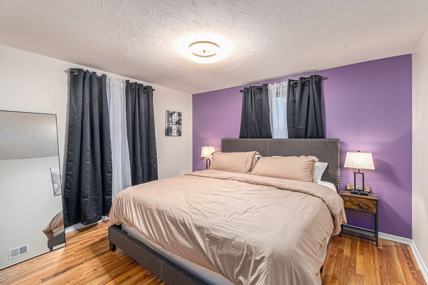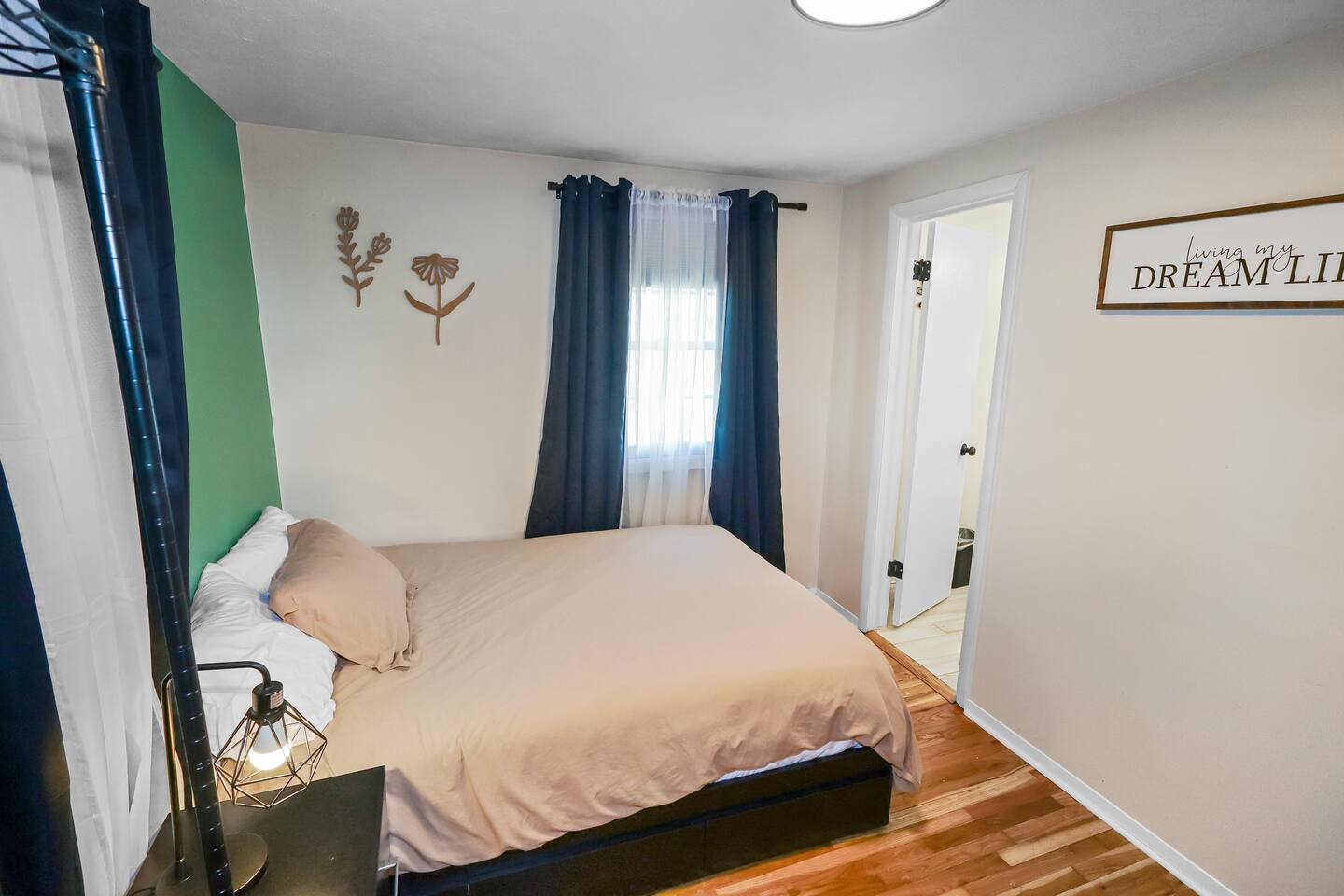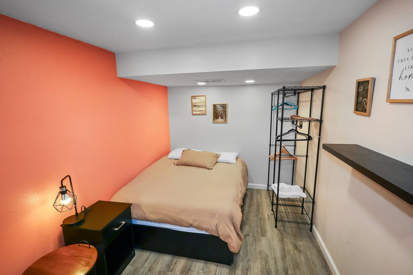 Easily convert this six bedroom home into three separate suites complete with a private bathroom, one king bed, one full bed, and a dedicated work space. With extensive amenities, a fully-stocked kitchen, laundry room, and a fully-fenced outdoor space, this home is perfect for accommodating groups. ★ LIVING ROOM ★ Experience bright, open-concept living with modern, sophisticated finishes. With a comfortable sofa, and an HDTV, you will be able to easily unwind, kick back, and relax each day. Note: The fireplace is decorative and not in use. Comfortable Couch Smart HDTV with Amazon Prime Carefully selected, modern furniture to ensure a beautiful stay ★ KITCHEN ★ Our kitchen is fully equipped with all the cookware, silverware, and appliances you may need to enjoy a quick bite for breakfast or a gourmet meal for dinner. Coffee Pot and Coffee Pots & Pans Basic Seasonings Plates, Glassware, & Silverware Microwave Oven, Refrigerator, and Dishwasher Dining Table and 12 Dining Chairs ★ SUITE 1 ★ The bedroom suites are carefully designed to provide you with a cozy, restful experience. Comfortable Room with King Bed Comfortable Room with Full Bed Dedicated Workspace Desk with High-Speed WIFI Large HDTV with Amazon Prime Private ensuite bathroom ★ SUITE 2★ Comfortable Room with King Bed Comfortable Room with Full Bed Dedicated Workspace Desk with High-Speed WIFI Large HDTV with Amazon Prime Private ensuite bathroom ★ SUITE 3★ Comfortable Room with King Bed Comfortable Room with Full Bed Dedicated Workspace Desk with High-Speed WIFI Large HDTV with Amazon Prime Private ensuite bathroom In-home 2 washer and 3 dryer machines are located in the basement for use during your stay. ★ BATHROOMS ★ Fully remodeled, these modern bathrooms feature everything you need to freshen up each day. Hotel Quality Towels & Linens Walk-In Shower Bathroom 2, has a BathTub. Essential Toiletries ★ OUTDOOR DECK & PATIO ★ Begin your day with morning coffee enjoyed on the open-air patio! With a fully-fenced privacy backyard and picnic seating for 12 guests, this home ensures a relaxing, peaceful stay. Oversized Outdoor Patio Four Large Picnic Tables Propane Grill Decorative String Lighting Fully Fenced Backyard
