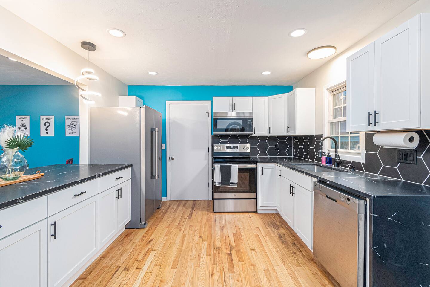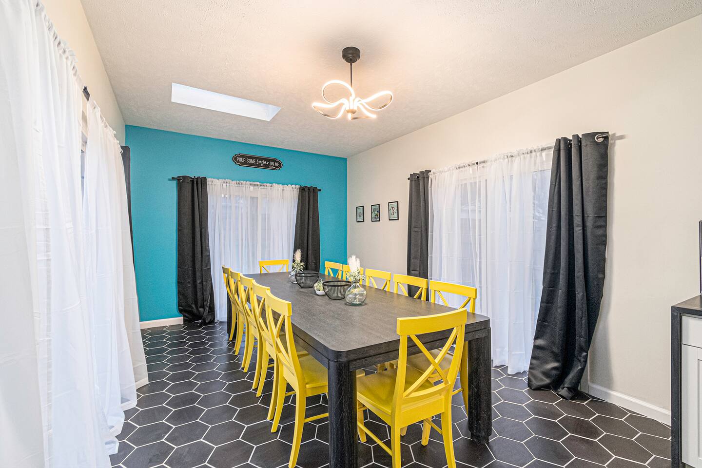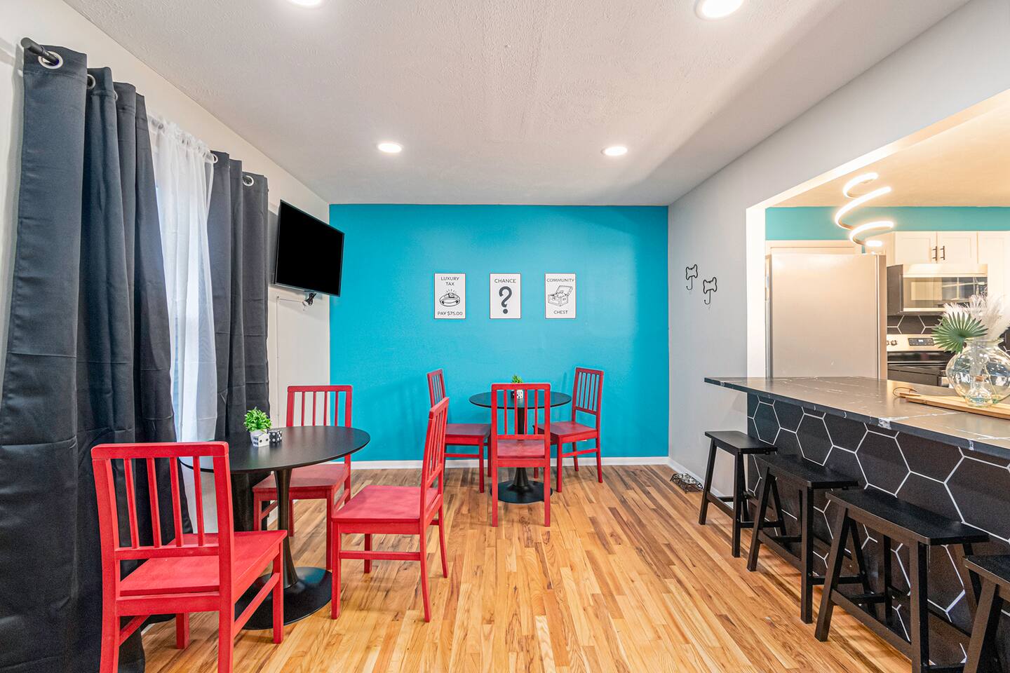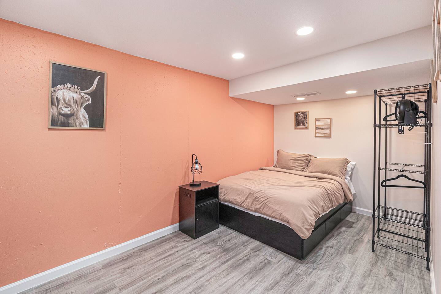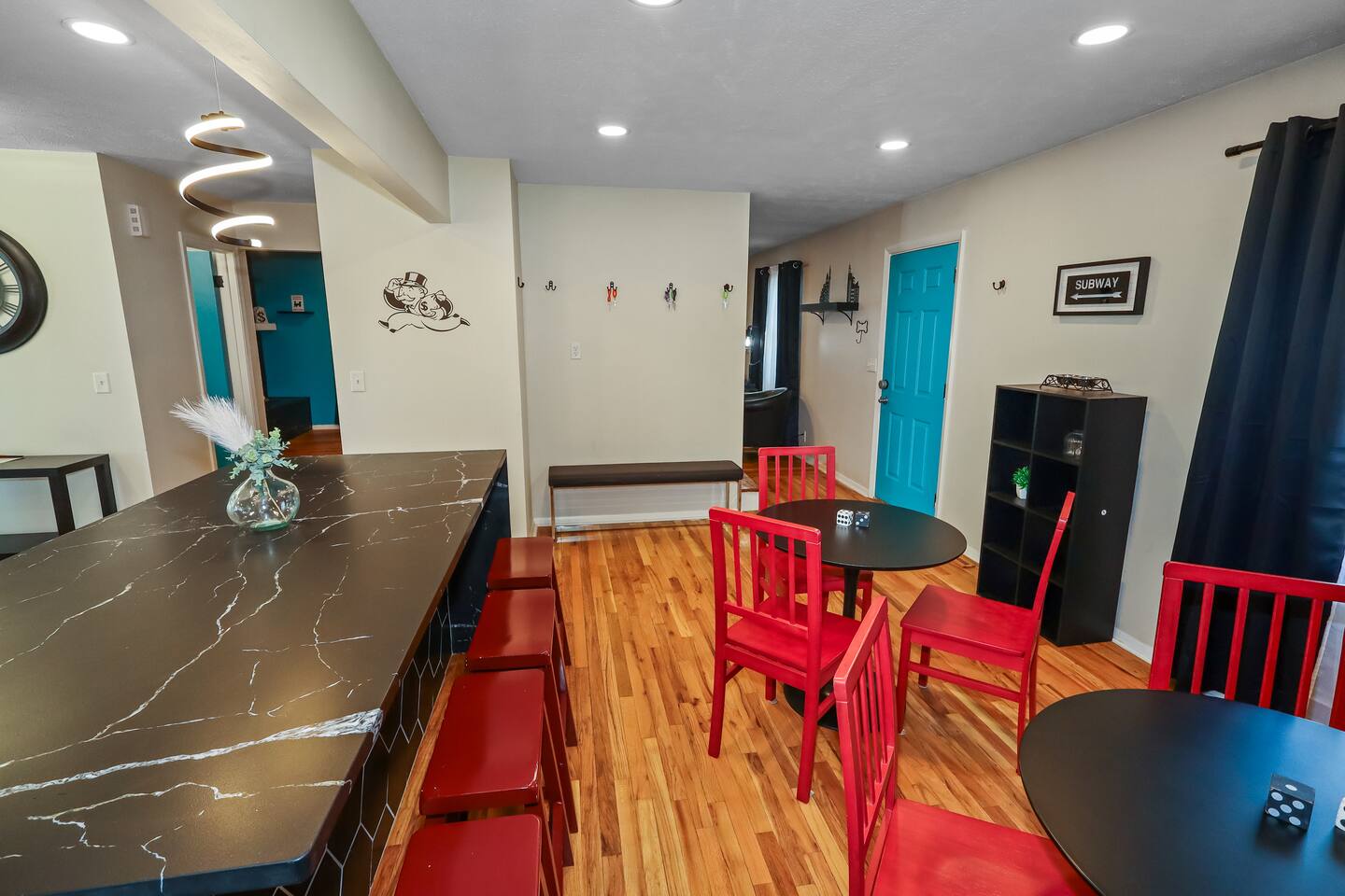 Easily convert this six bedroom home into three separate suites complete with a private bathroom, one king bed, one full bed, and a dedicated work space. With extensive amenities, a fully-stocked kitchen, laundry room, and a fully-fenced outdoor space, this home is perfect for accommodating groups. ★ LIVING ROOM ★ Experience bright, open-concept living with modern, sophisticated finishes. With a comfortable sofa, and an HDTV, you will be able to easily unwind, kick back, and relax each day. Note: The fireplace is decorative and not in use. Comfortable Couch Smart HDTV with Amazon Prime Carefully selected, modern furniture to ensure a beautiful stay ★ KITCHEN ★ Our kitchen is fully equipped with all the cookware, silverware, and appliances you may need to enjoy a quick bite for breakfast or a gourmet meal for dinner. Coffee Pot and Coffee Pots & Pans Basic Seasonings Plates, Glassware, & Silverware Microwave Oven, Refrigerator, and Dishwasher Dining Table and 12 Dining Chairs ★ SUITE 1 ★ The bedroom suites are carefully designed to provide you with a cozy, restful experience. Comfortable Room with King Bed Comfortable Room with Full Bed Dedicated Workspace Desk with High-Speed WIFI Large HDTV with Amazon Prime Private ensuite bathroom ★ SUITE 2★ Comfortable Room with King Bed Comfortable Room with Full Bed Dedicated Workspace Desk with High-Speed WIFI Large HDTV with Amazon Prime Private ensuite bathroom ★ SUITE 3★ Comfortable Room with King Bed Comfortable Room with Full Bed Dedicated Workspace Desk with High-Speed WIFI Large HDTV with Amazon Prime Private ensuite bathroom In-home 2 washer and 3 dryer machines are located in the basement for use during your stay. ★ BATHROOMS ★ Fully remodeled, these modern bathrooms feature everything you need to freshen up each day. Hotel Quality Towels & Linens Walk-In Shower Bathroom 2, has a BathTub. Essential Toiletries ★ OUTDOOR DECK & PATIO ★ Begin your day with morning coffee enjoyed on the open-air patio! With a fully-fenced privacy backyard and picnic seating for 12 guests, this home ensures a relaxing, peaceful stay. Oversized Outdoor Patio Four Large Picnic Tables Propane Grill Decorative String Lighting Fully Fenced Backyard