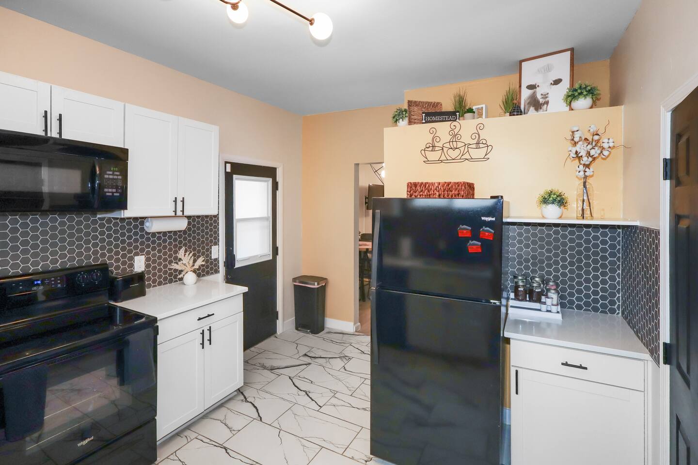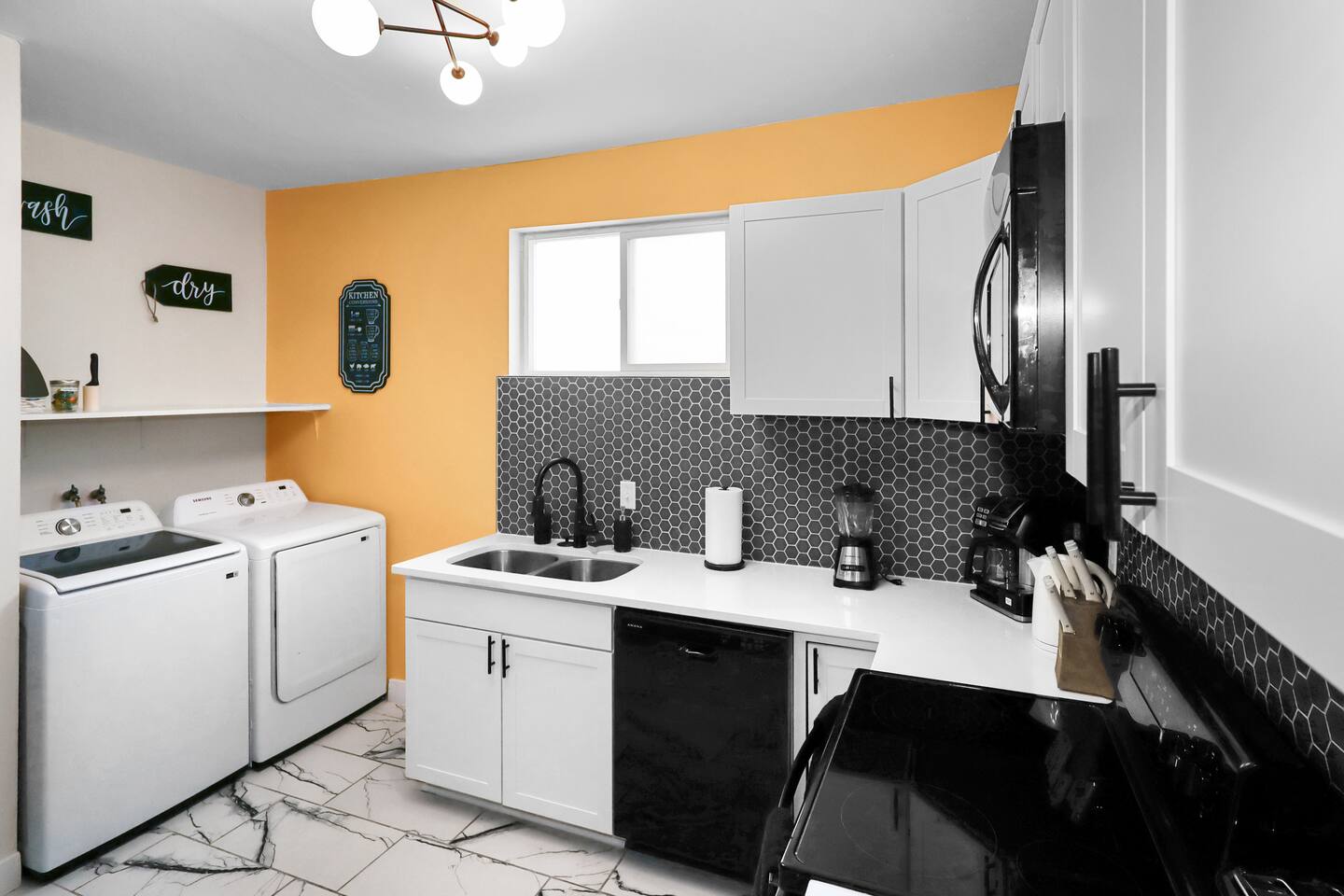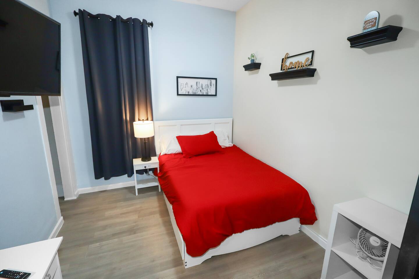 Enjoy the ease of a fully-equipped kitchen and the luxury of an in-home washer and dryer. Every detail is designed to make you feel right at home. Comfortably sleeps 3 guests, this home has a complete kitchen, 2 bedrooms, 1 bathroom, a covered patio, and a 6’ dog-friendly fully-fenced backyard. ★ LIVING ROOM ★ Upon entrance, you are welcomed with an inviting, open floor plan and modern, bright finishes. With a comfortable sofa and an HDTV, you will be able to easily unwind, kick back, and relax after a full day of travel. ⦁ Comfortable Couch ⦁ Reclining Lounge Chair ⦁ Smart HDTV with Amazon Prime TV ⦁ Carefully selected, modern furniture to ensure a beautiful stay ★ KITCHEN ★ Our kitchen is fully equipped with all the cookware, silverware, and appliances you may need to enjoy a quiet breakfast meal or prepare a gourmet dinner at home. ⦁ Coffee Pot and Coffee ⦁ Pots & Pans ⦁ Plates, Glassware, & Silverware ⦁ Children’s Dinnerware ⦁ Blender, Microwave, and More ⦁ Oven, Refrigerator, and Dishwasher ⦁ Dining Table and 4 Dining Chairs In-home washer and dryer machines are located in the kitchen for use during your stay. Detergent included for your convenience. ★ BEDROOM 1★ The bedrooms are carefully designed to provide you with a cozy, restful experience. ⦁ Comfortable King Bed ⦁ Clothing Rail with Included Hangers ⦁ Portable Fan ⦁ Large HDTV ★ BEDROOM 2★ ⦁ Comfortable Full Bed ⦁ Portable Fan ⦁ Large HDTV ⦁ Dedicated Workspace Desk with High-Speed WIFI ★ BATHROOM ★ Fully remodeled, this modern bathroom features everything you need to freshen up each day. ⦁ Luxurious Rain-Fall Shower ⦁ Soaking Bathtub ⦁ Essential Toiletries ⦁ Extra Towels & Linens ⦁ First Aid Kit & Kleenex ★ COVERED PATIO & PRIVACY BACKYARD ★ Enjoy your morning coffee on the sunlit, covered patio and end your day with freshly grilled burgers prepared on the backyard grill! With a 6’ privacy fence, this home is the perfect vacation spot for both you and your furry friend! ⦁ Covered Porch Patio ⦁ Propane Grill ⦁ 6’ Dog-Friendly Privacy Fence