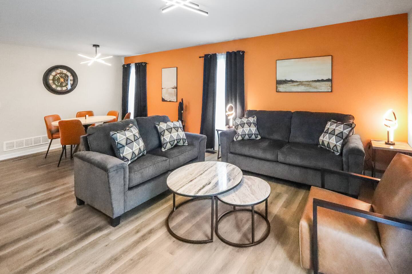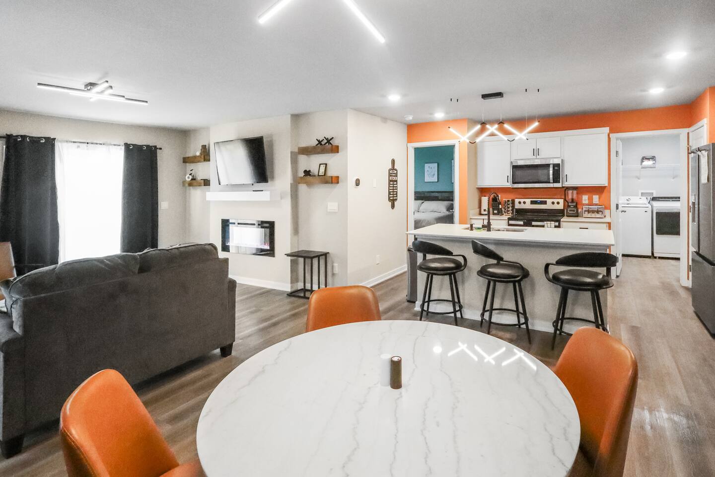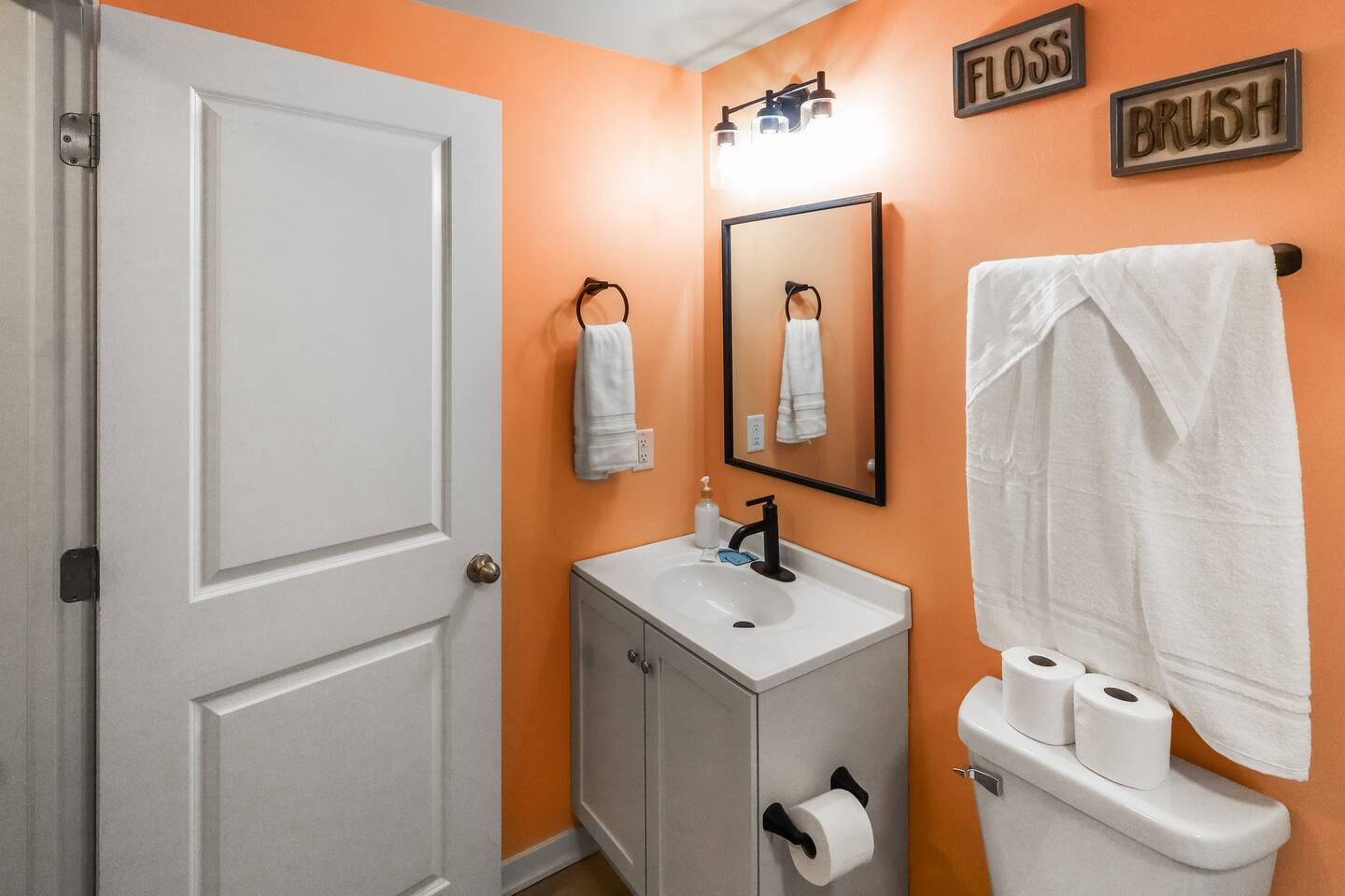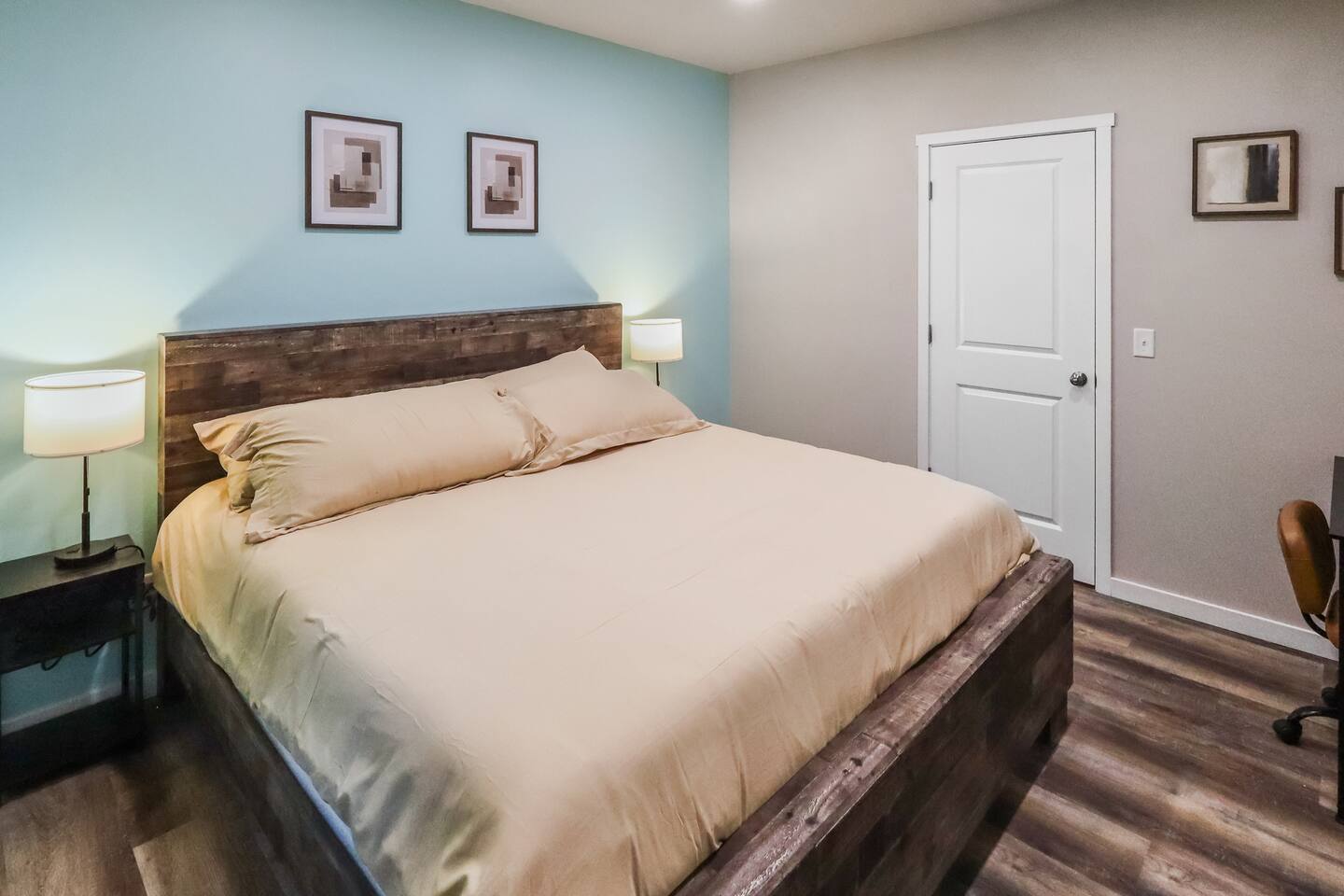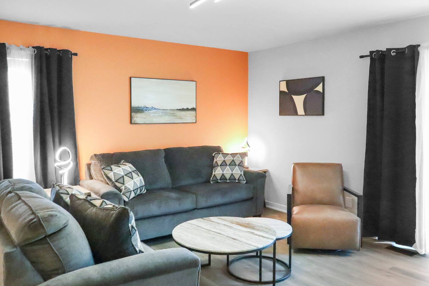 This premium five-bedroom home comfortably sleeps 7 guests. You will find a 5-bedroom, 3 full bathroom home with a fully stocked kitchen, a basement kitchenette, a laundry room (located upstairs), a fully fenced outdoor space, a deck, and a Weber grill.