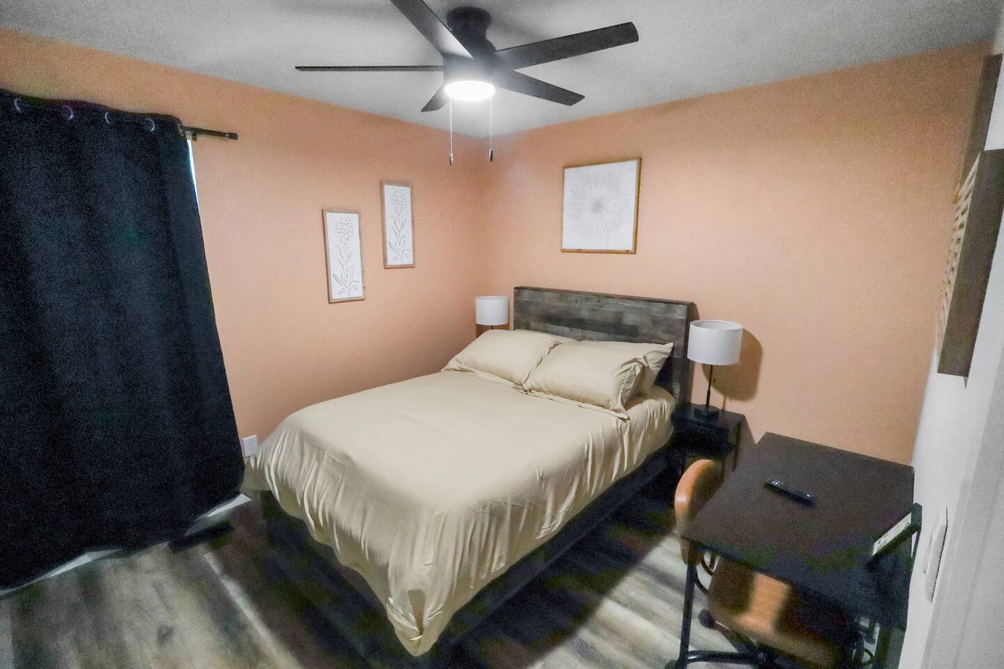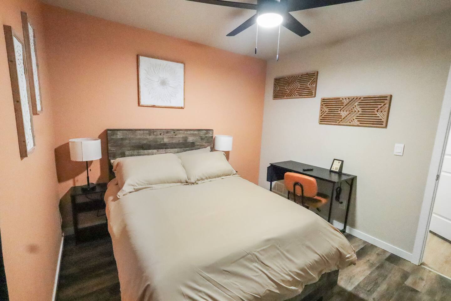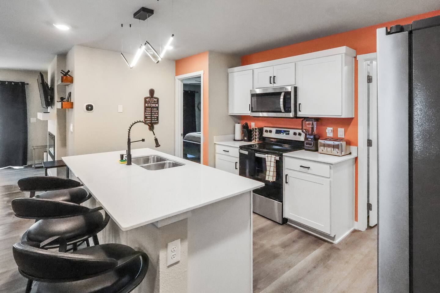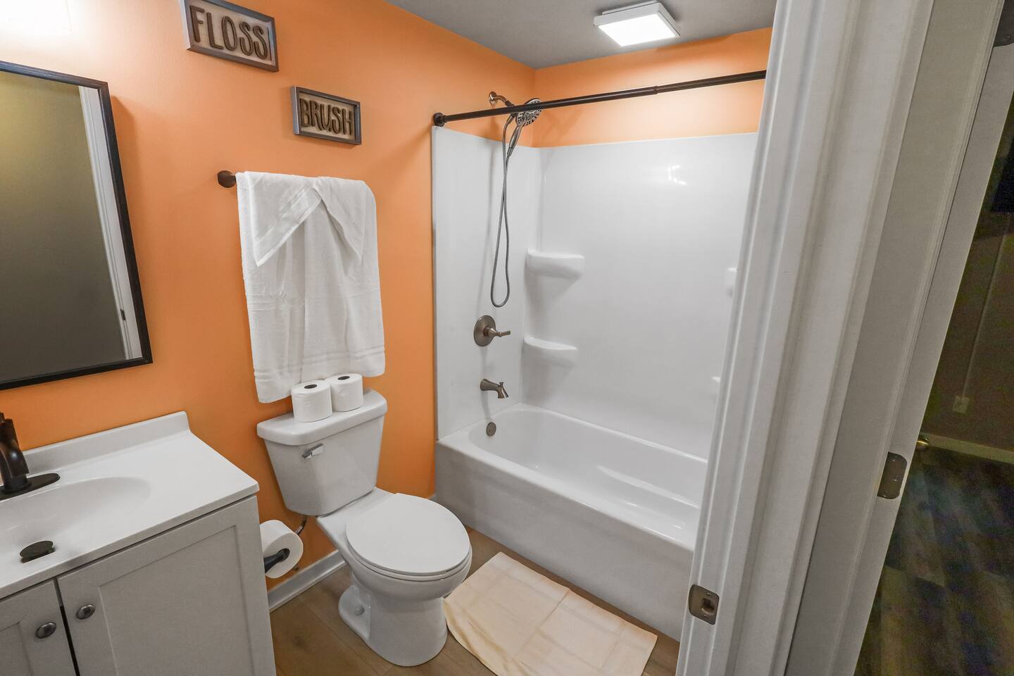 This premium five-bedroom home comfortably sleeps 7 guests. You will find a 5-bedroom, 3 full bathroom home with a fully stocked kitchen, a basement kitchenette, a laundry room (located upstairs), a fully fenced outdoor space, a deck, and a Weber grill.